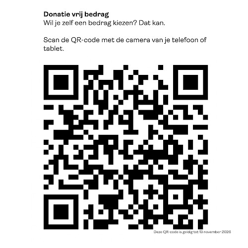 Wil je zelf een bedrag kiezen? Dat kan. Scan de onderstaande rechter QR-code met de camera van je telefoon of tablet, vul een bedrag naar keuze in en doneer!